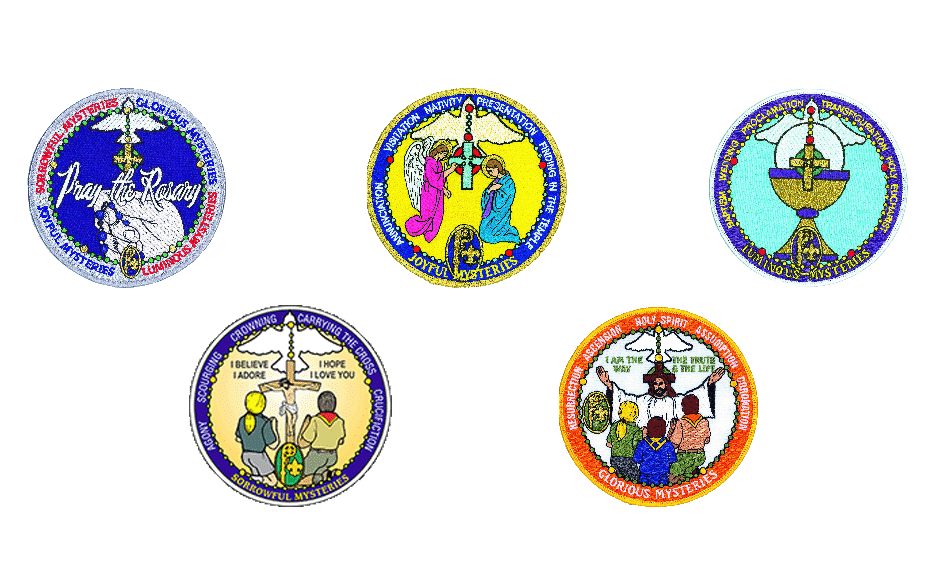 There are 5 activities in all. They are the Joyful Mysteries, Luminous Mysteries, Sorrowful Mysteries, Glorious Mysteries, and Pray the Rosary. A beautiful 5″ diameter patch is available with each activity.